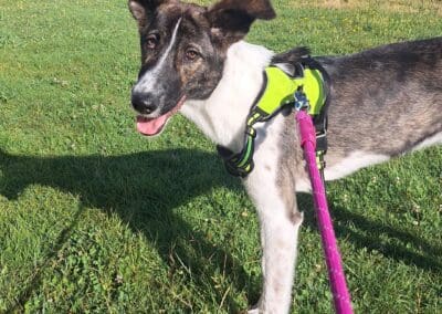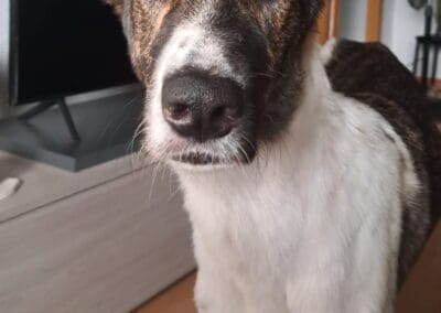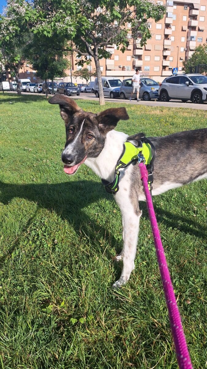Fresa es muy sociable. En los paseos tiene mucha energía, pero en casa es muy tranquila, y suele pasar el día durmiendo.