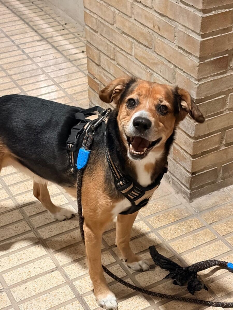 Este perro tan simpático es Lilo. Es mezcla de border collie con beagle. Tiene 7 años Es muy cariñoso con las personas y con los niños.