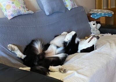 En casa es un perro cariñoso, tranquilo la mayor parte del tiempo. Solo ladra con el timbre o ruidos en el rellano. Por la calle, con ciertos perros tiene algunos problemas para relacionarse (ladridos, gruñidos…).